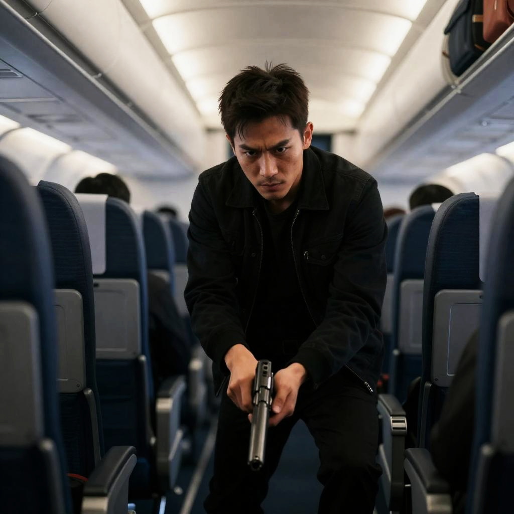 Man with short, dark hair in a black jacket, holding a gun, crouching in an airplane aisle. Intense expression. Blurred motion in the background. Overhead luggage racks and seats visible. Dim, tense lighting. One other partially visible passenger in the background.