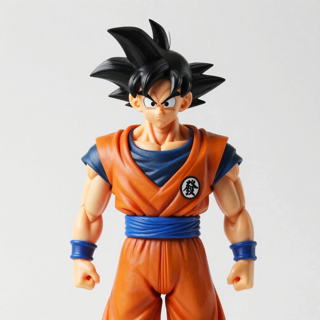 Realistic photo.Action figure of Goku from Dragon Ball Z with orange gi, spiky black hair. Styled as product photography with a simple face, shot in high resolution. realistic photo