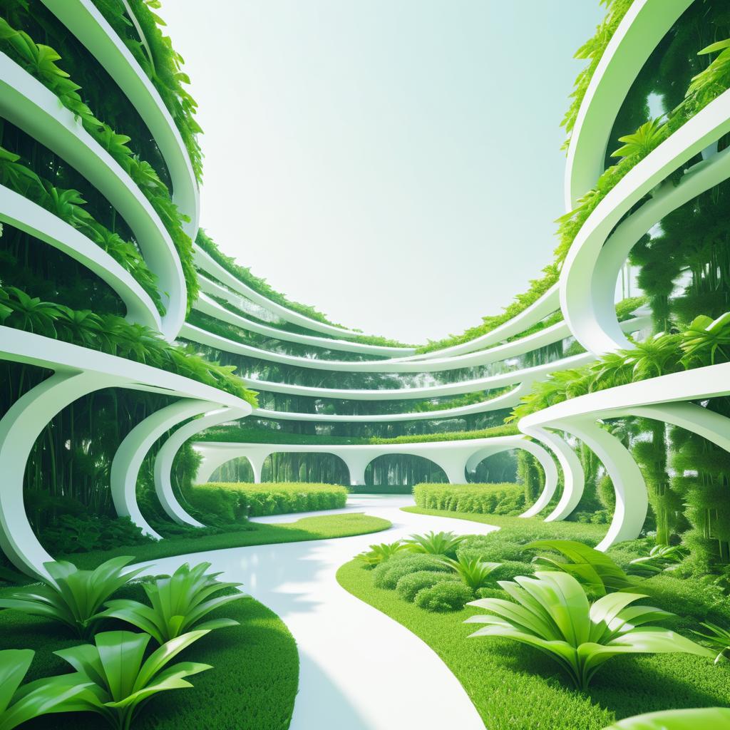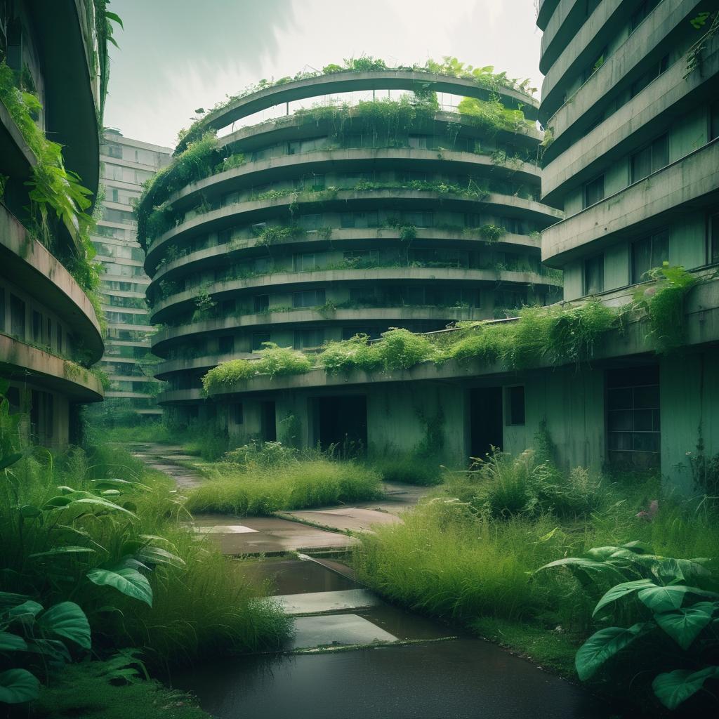 Abandoned urban apartment buildings with semicircular architecture, overtaken by dense green vegetation and overgrown grass. The scene features a desolate paved pathway, moody and soft atmospheric lighting, and a futuristic yet decaying ambiance. The nature reclamation highlights environmental themes in urban settings.