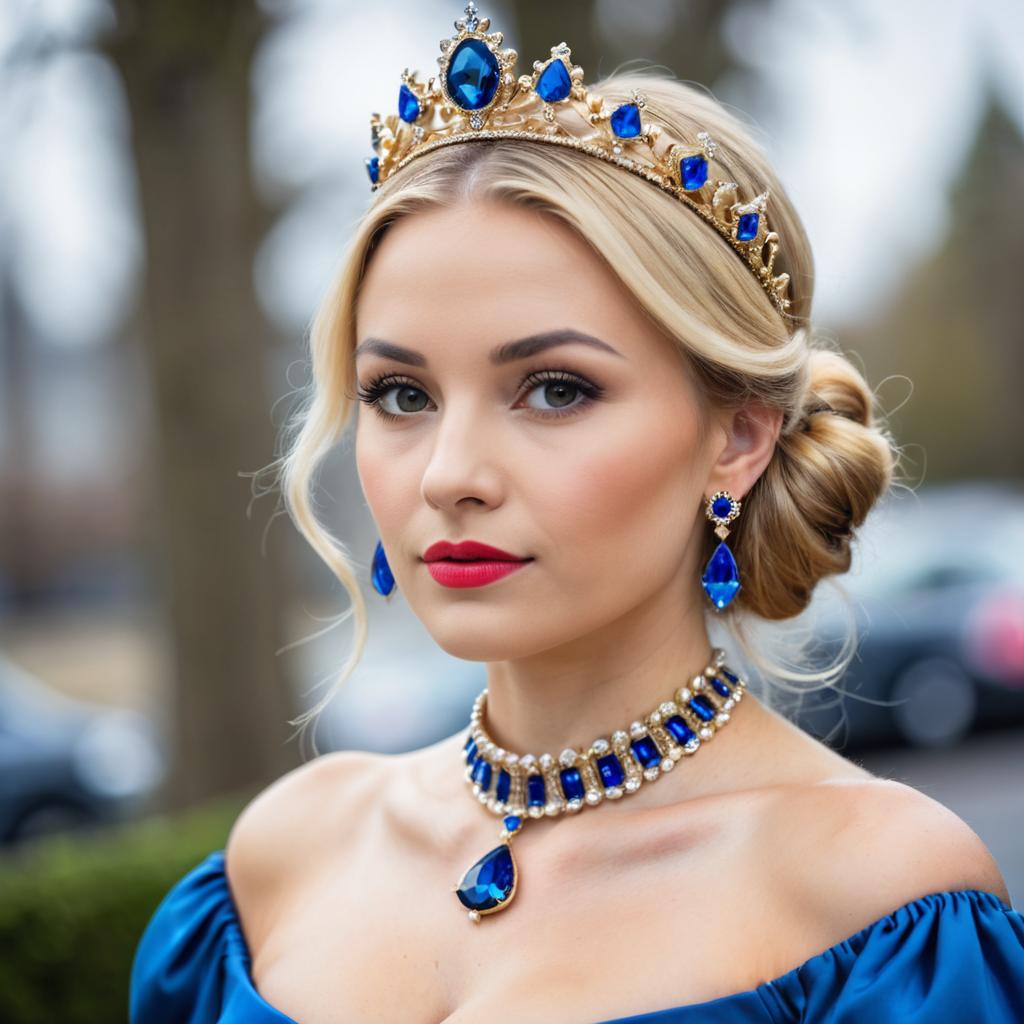Close-up portrait of a blonde woman wearing a white off-shoulder dress adorned with blue and silver gemstones. She has long hair and blue eyes, accessorized with a matching blue gem tiara and necklace. The background is blurred, emphasizing the subject's face and upper body in a realistic style.