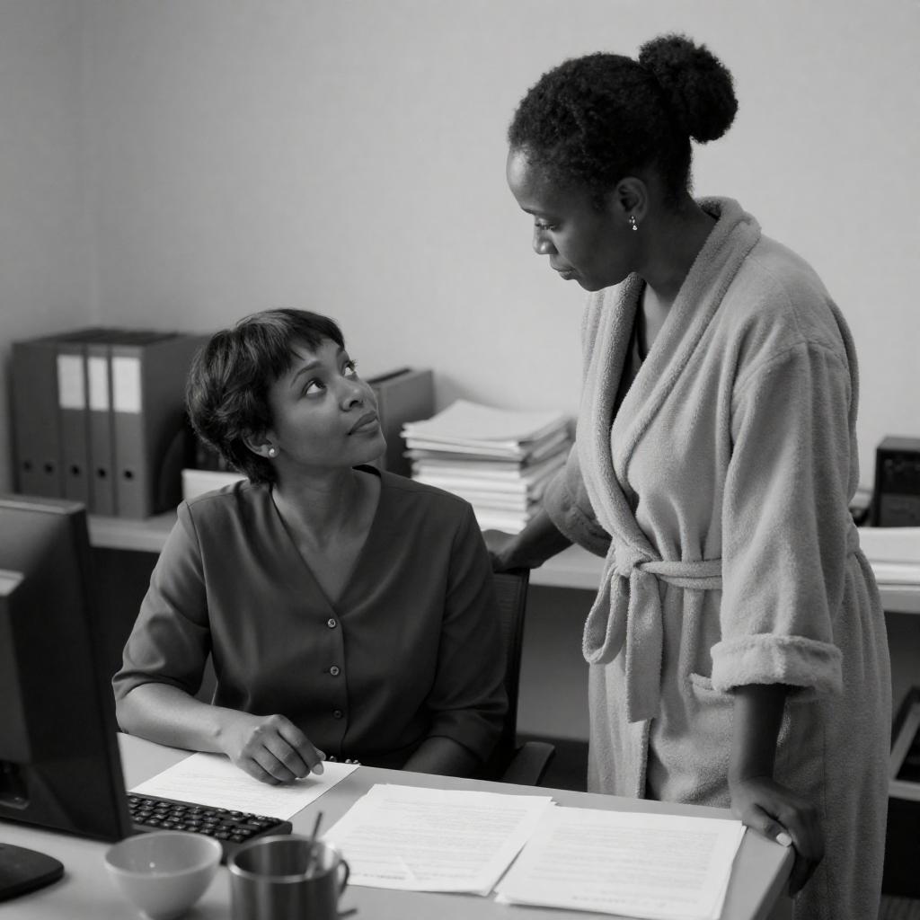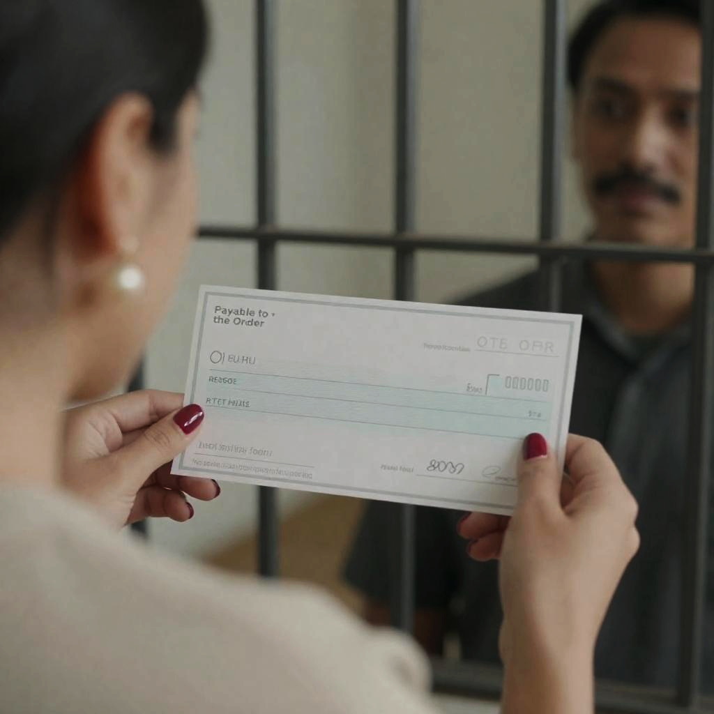 Photograph of a hand holding a check with "Payable to the Order of" in the top left corner. Check is partially obscured by metal bars. Woman with pearl earrings, visible from the back, has red nail polish. Man with a mustache, partially visible through bars, has a neutral expression. Check is held in front of her, slightly to the right. Soft, indoor lighting.