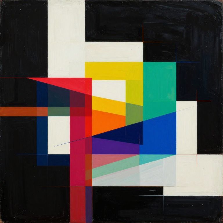 Dall-E styles in a minimalist geometric abstraction, sharp lines and colorful polygons, stark contrast background, fusion of digital glitch effects and traditional painting strokes, bold composition, modern art gallery vibe