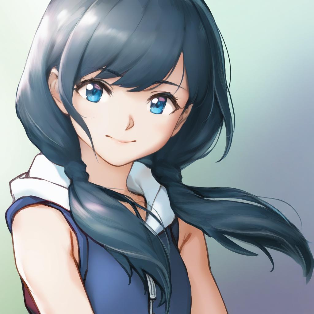 Illustration of an anime girl with long black hair styled in low twintails, blue eyes, and a gentle smile. She is wearing a sleeveless white jacket with a maroon hood down, exposing her bare arms. The art style is inspired by the work of artist Shiba Itsuki and resembles characters from the anime Tenki no Ko.