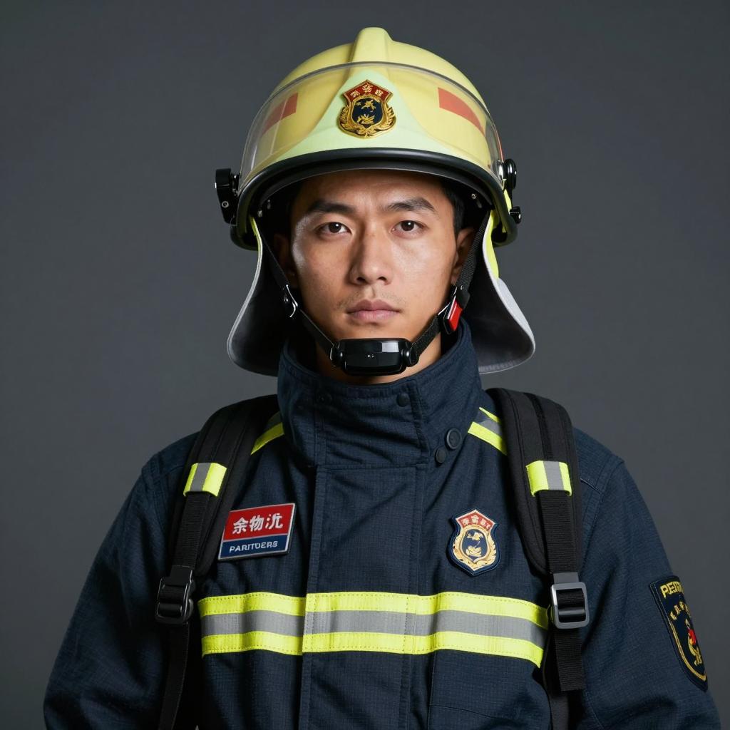 Adult boy police officer, photograph of a young man, standing, wearing a tan military uniform with a black necktie, black visor cap with silver emblem, two silver badges on chest, neutral expression, short brown hair, light skin, brown eyes, indoor background with beige wall, soft lighting, slight blur on background, portrait orientation, realistic style, military uniform, detailed ures on fabric, clean and formal appearance