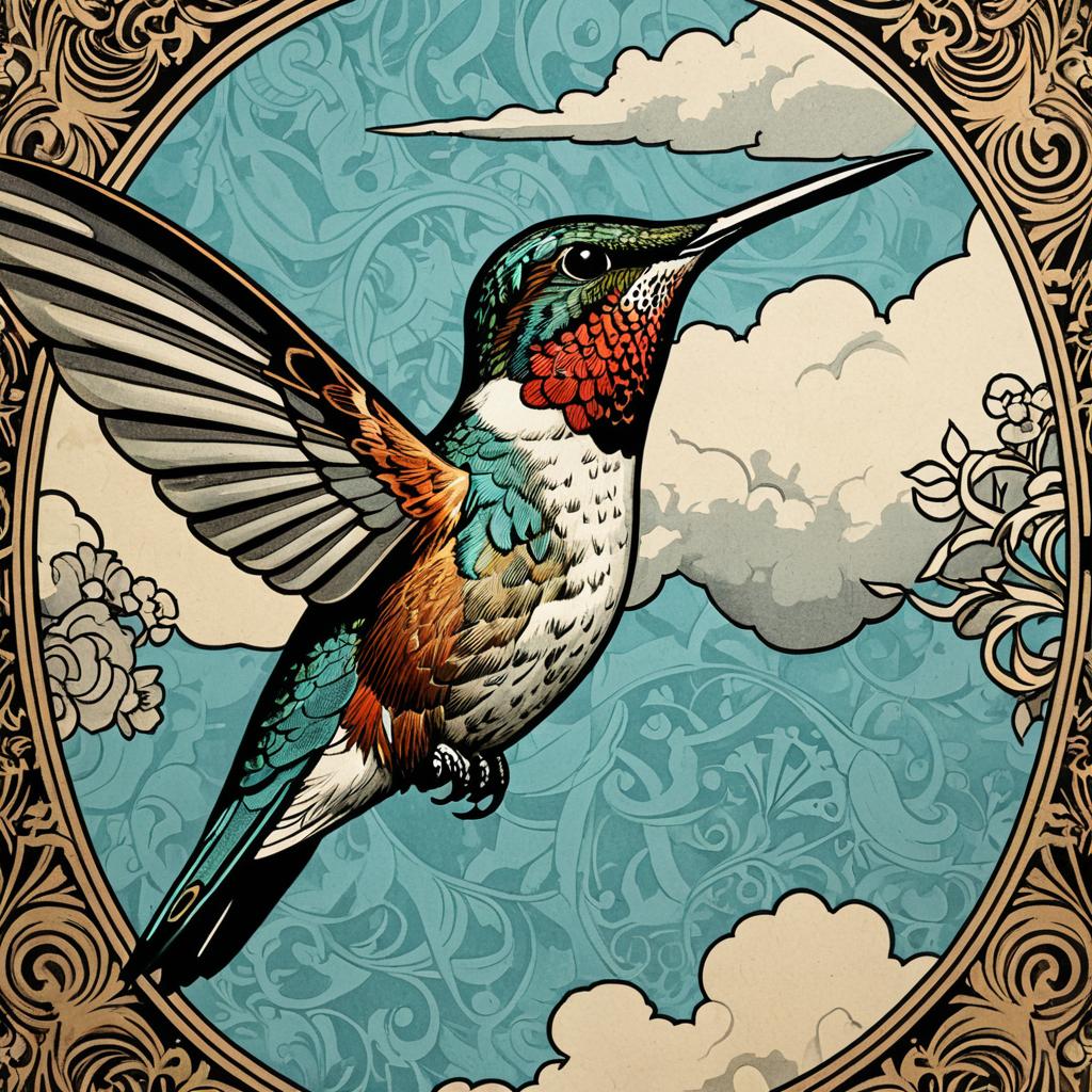 A detailed painting of a hummingbird intricately woven from nebula clouds, featuring vivid pastel colors. The bird has sharp lines, large vivid eyes, and richly textured feathers in shades of turquoise, pink, orange, and green. The background is a vast cosmic sky with swirling clouds and starry details, inspired by artists Daisuke Ishiwatari, Brian Froud, and Marija Prymatschenko.