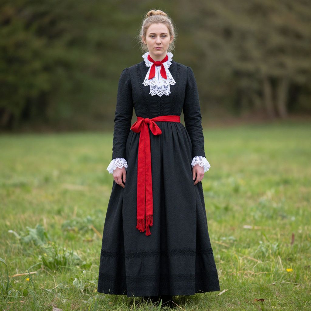 "Victorian Peasant Dress, woman in black dress with red sash and white lace"