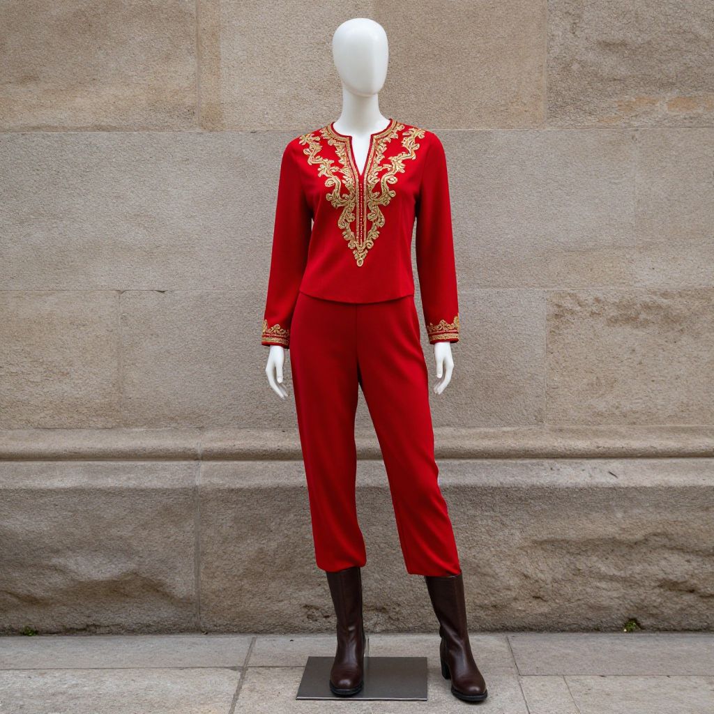 A mannequin wearing a red outfit with gold embroidery and brown boots, standing in front of a stone wall. The mannequin has a sleek, modern design with a confident posture, emphasizing its elegance and sophistication. The red outfit features intricate gold embroidery detailing, while the brown boots add a touch of classic style. The stone wall in the background adds a stark, timeless contrast to the mannequin's vibrant attire, creating a striking visual composition.