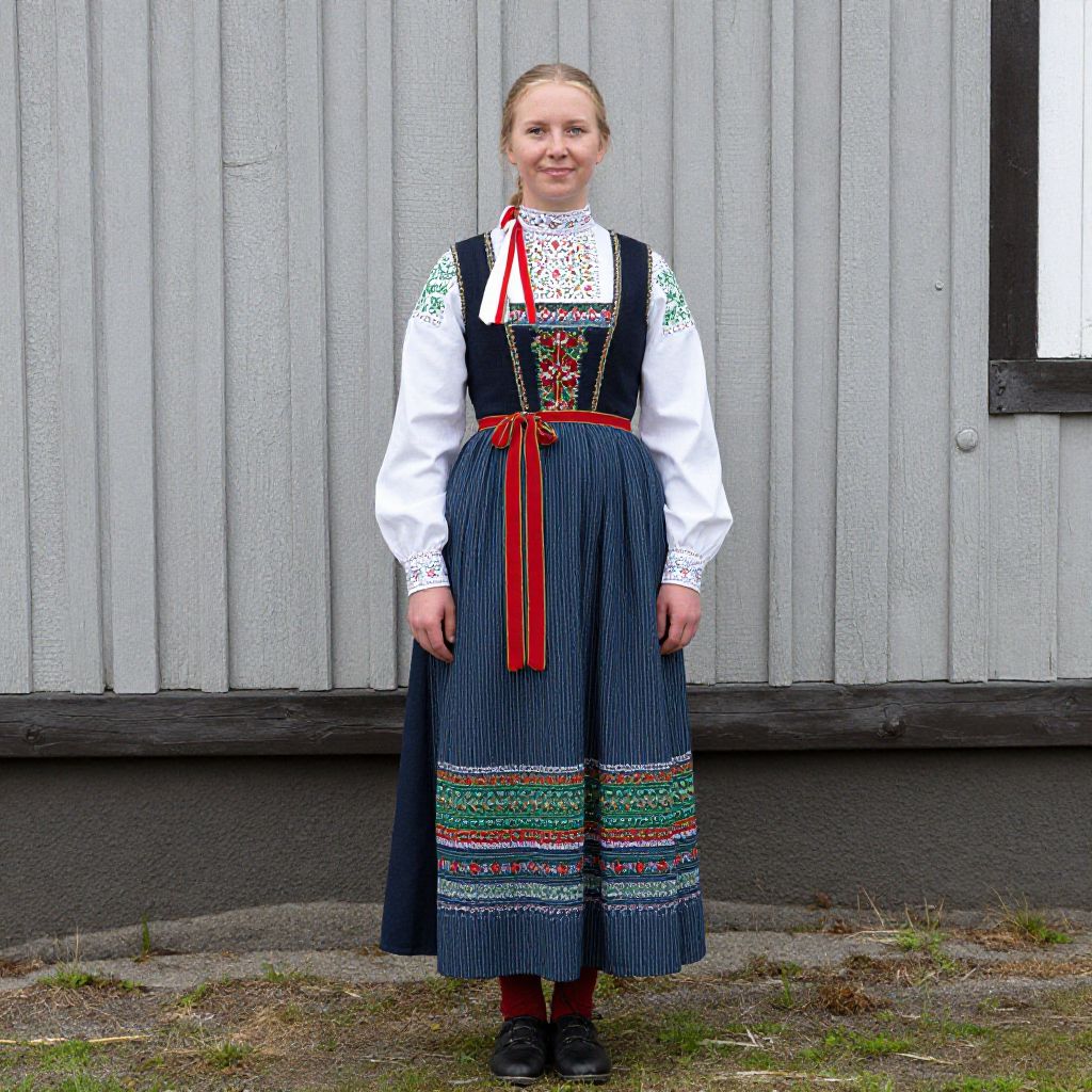 "Traditional Swedish Folk Dress, woman in traditional dress standing in front of a wall"