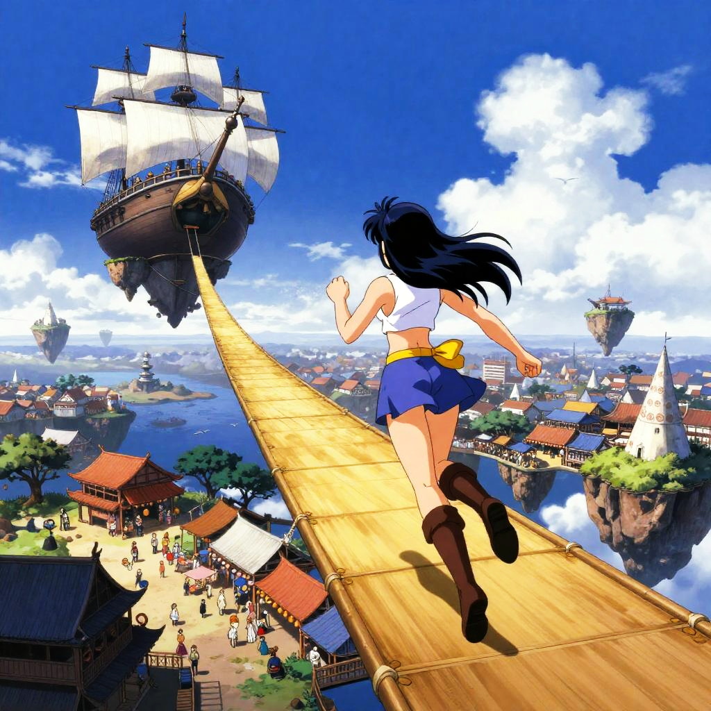 Sky-Pirate Swordswoman, Yoshitaka Amano, Surreal, mysterious, bizarre, fantastical, fantasy, sci-fi, Japanese anime, bustling aerial bazaar on a sky-bridge between floating islands at golden hour, miniskirt beautiful swordsman running towards the airship on the tethered rope, perfect voluminous body, blue sky, clouds, detailed masterpiece bird’s eye views