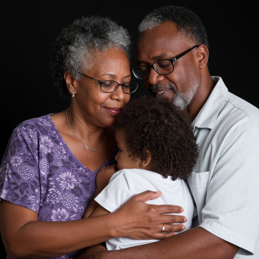 In the image, an older black couple is tenderly embracing a young child. The woman, with curly gray hair and glasses, is wearing a purple floral shirt and a necklace, while the man, with a gray beard and glasses, is dressed in a light-colored shirt. The child, with dark curly hair, is being held close to the woman, creating a heartwarming scene of affection and family bonding. The background is dark, which contrasts with the subjects, making them the focal point of the image. The overall composition is intimate and warm, capturing a moment of connection between the generations.