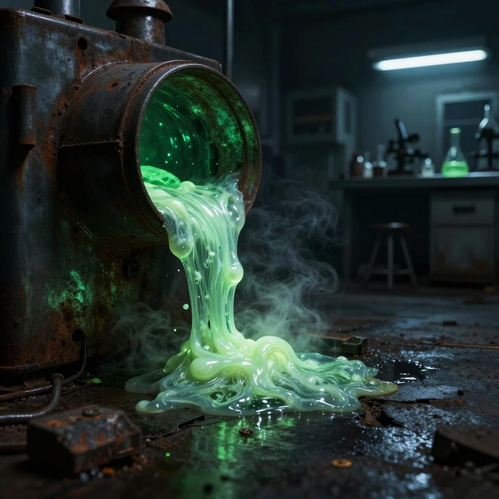 Radioactive goo bubbling in a dark, abandoned laboratory with glowing green hues illuminating rusty metal surfaces, eerie mist rising, detailed textures of the viscous liquid spreading across cracked concrete, cinematic lighting, sci-fi horror atmosphere.