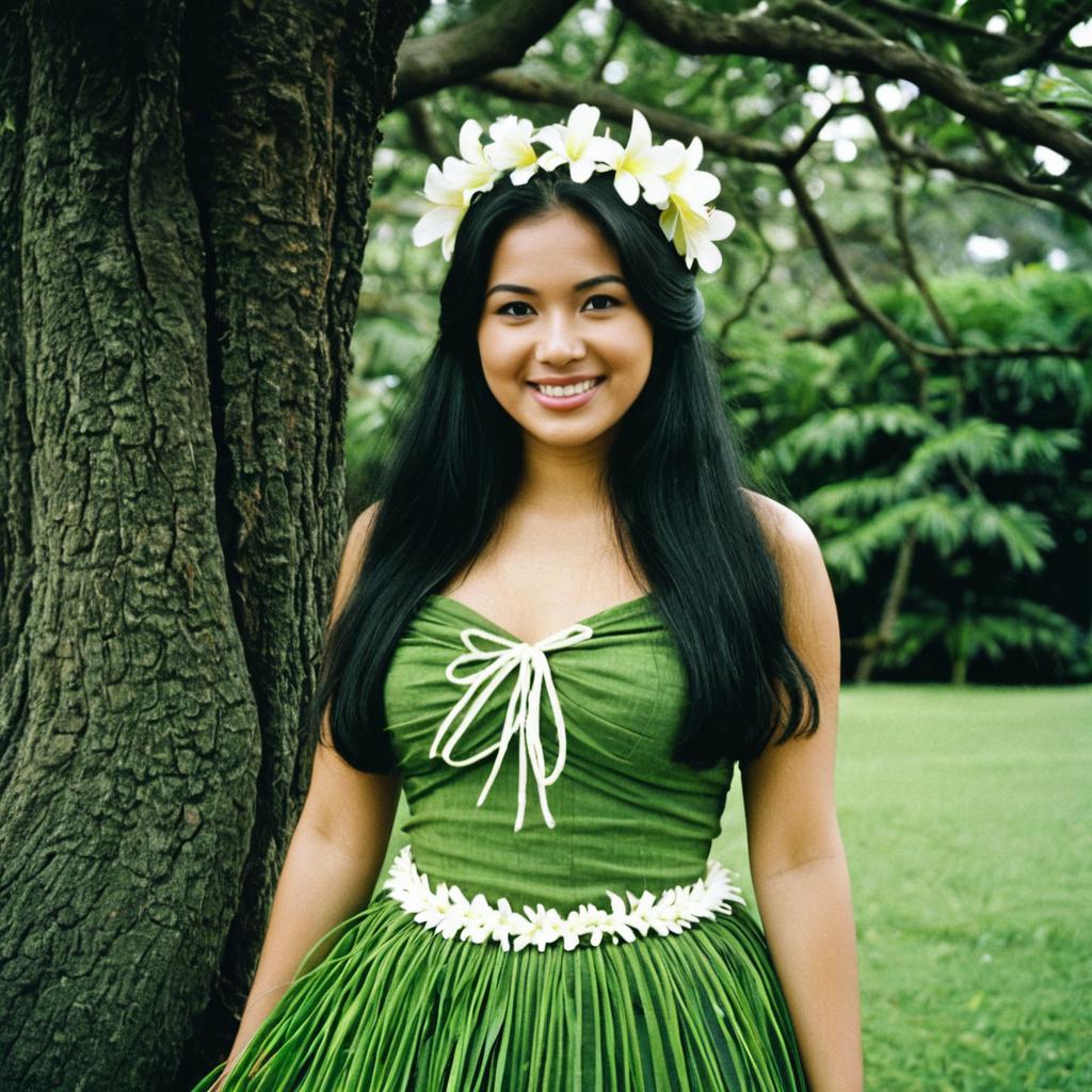 Authentic hula costume,1girl, solo, dress, green dress, black hair, tree, long hair, flower, realistic, hair ornament, smile, hair flower, lips, nature, outdoors, looking at viewer