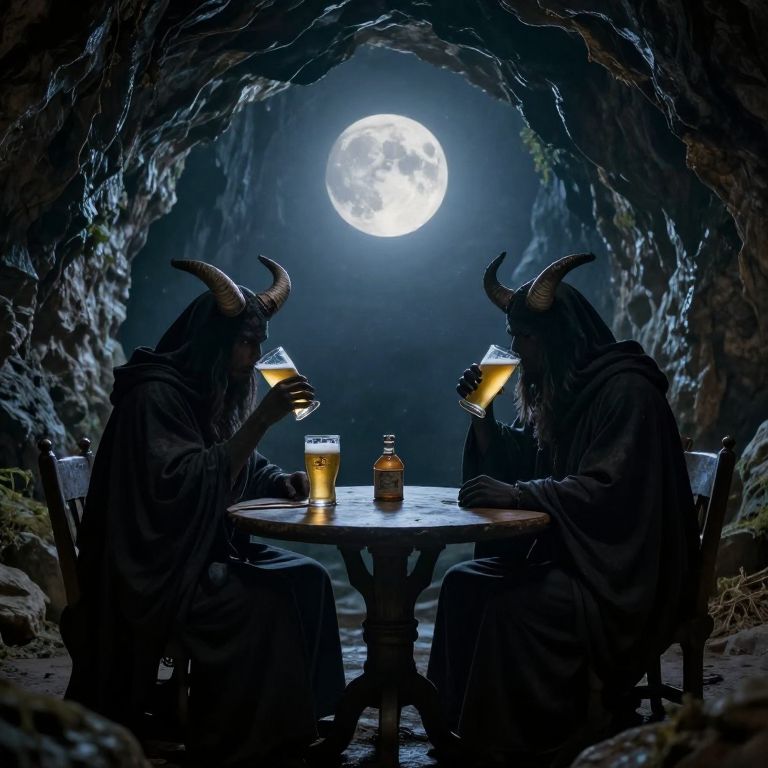 Photograph of two dark-robed, horned demons seated at a small round table in a cave-like setting, illuminated by a bright full moon through the entrance. Both demons, with black hooded cloaks and large curved horns, hold glasses of beer, one on the left and one on the right. A bottle of beer and another glass are on the table between them. The cave walls are rough and textured, adding a mysterious atmosphere. The moonlight casts a bluish glow, contrasting with the warm yellow light from the beer glasses. The demons' faces are obscured by shadows, enhancing the eerie, supernatural vibe.