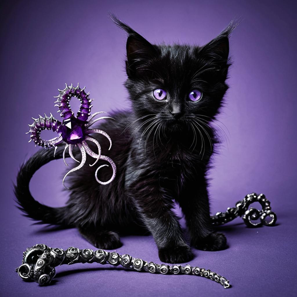 A digitally created image of a fluffy black kitten with striking bright purple eyes, small purple bat-like wings, and multiple crystal-shaped purple tentacle tails. The kitten plays with additional purple tentacles in front of a glowing full moon backdrop, creating a mystical and otherworldly atmosphere.