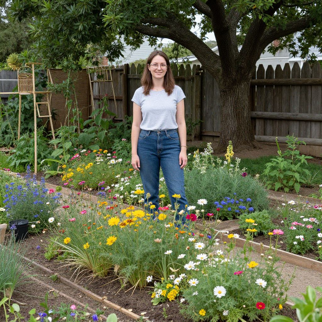 Woman standing amidst a vibrant permaculture garden, surrounded by colorful wildflowers, green foliage, and a rustic wooden fence, with a tree providing shade in the background.