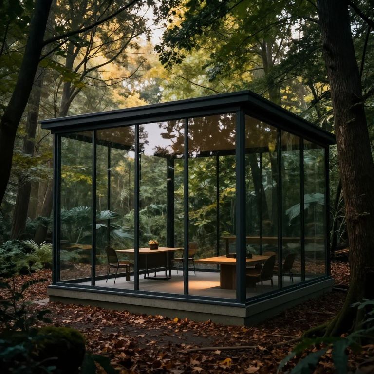 Fashionable /imagine a small secluded architectural space made of glass that reflects its surrounds of a mildly lit forest with tree canopy overhead and leaves falling cinematic,