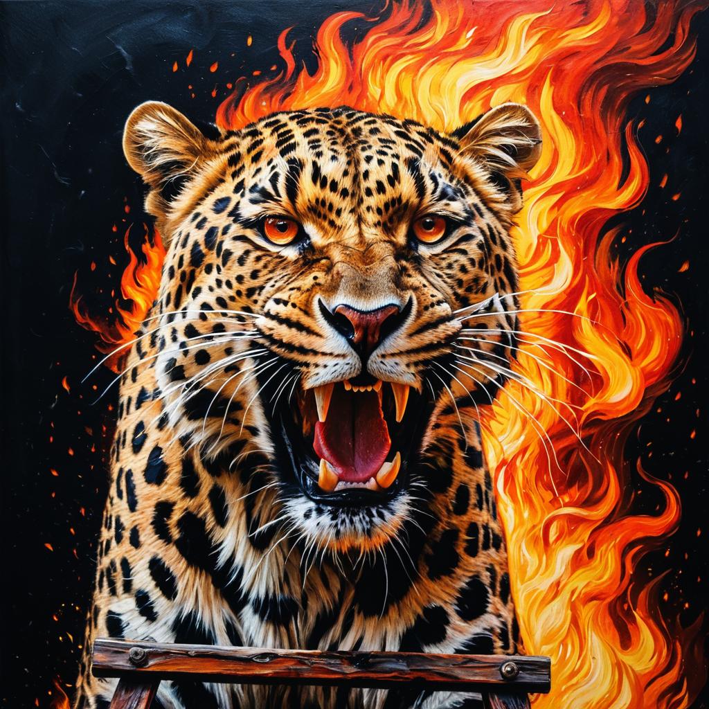 Hyper-realistic oil painting style portrait of a large leopard with fierce expression and spotted fur, surrounded by swirling flames and a dramatic fiery background, showcasing a mesmerizing blend of orange, red, and smoky tones.