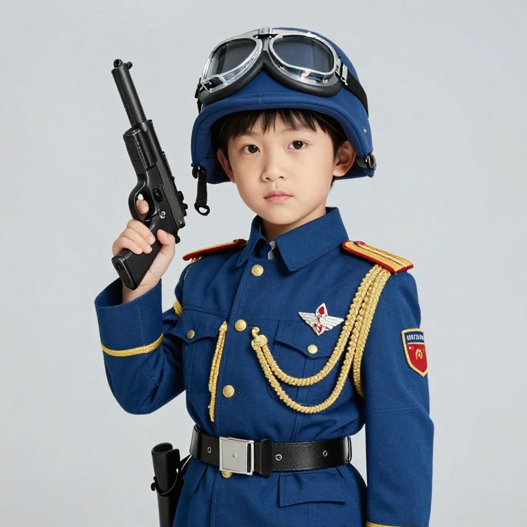 A young boy is dressed in a blue military uniform with gold accents. He is holding a gun in his right hand and wearing a helmet with goggles on top.