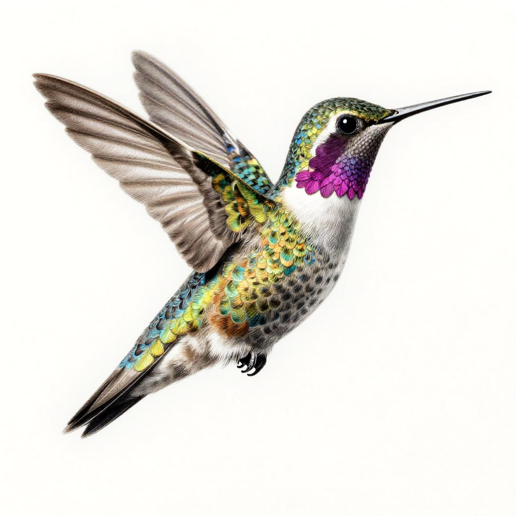 Intricate pencil drawing by Albrecht Dürer depicting a hummingbird with iridescent feather textures, with vibrant plumage, delicate shading, and mid-flight position, in energetic and lively, masterfully detailed