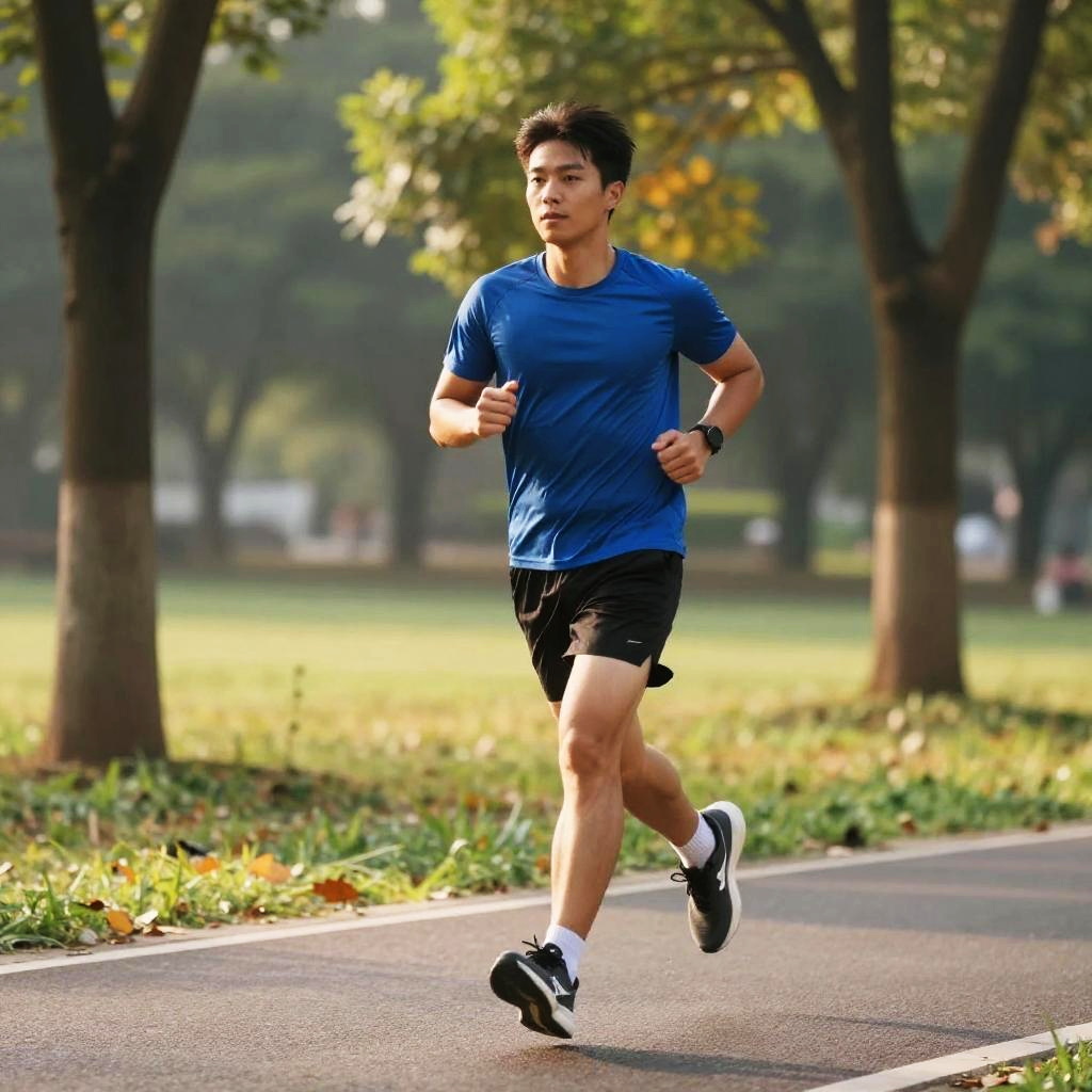 Normal physique athlete jogging in a park during sunrise, dynamic motion, casual sportswear, vibrant natural colors, detailed trees and path, realistic body proportions