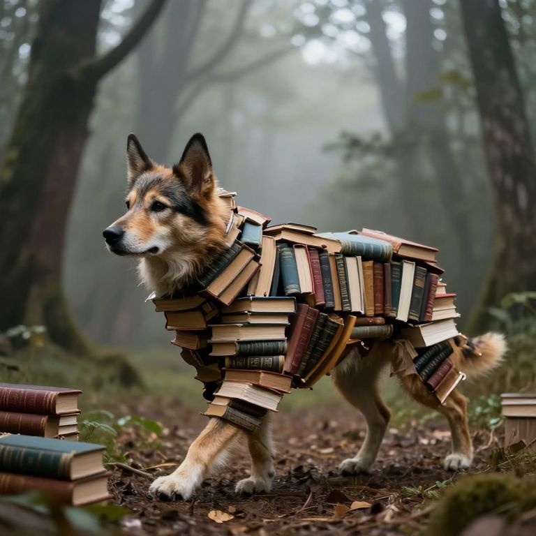 Medium-sized dog wearing a creative coat made entirely of stacked hardcover books, walking through a misty forest with tall trees and a soft focus background. The dog's fur is brown and black, resembling a German Shepherd or similar breed, blending natural elements with imaginative book art.