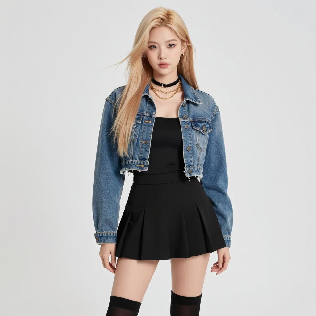 Portrait of a fashionable young Asian woman posing against a dark background. She is wearing a black wide-brimmed hat, a cropped black lace-up top, a pleated black leather skirt, and a matching black leather jacket. The look combines edgy and modern minimalist style with bold fashion elements.