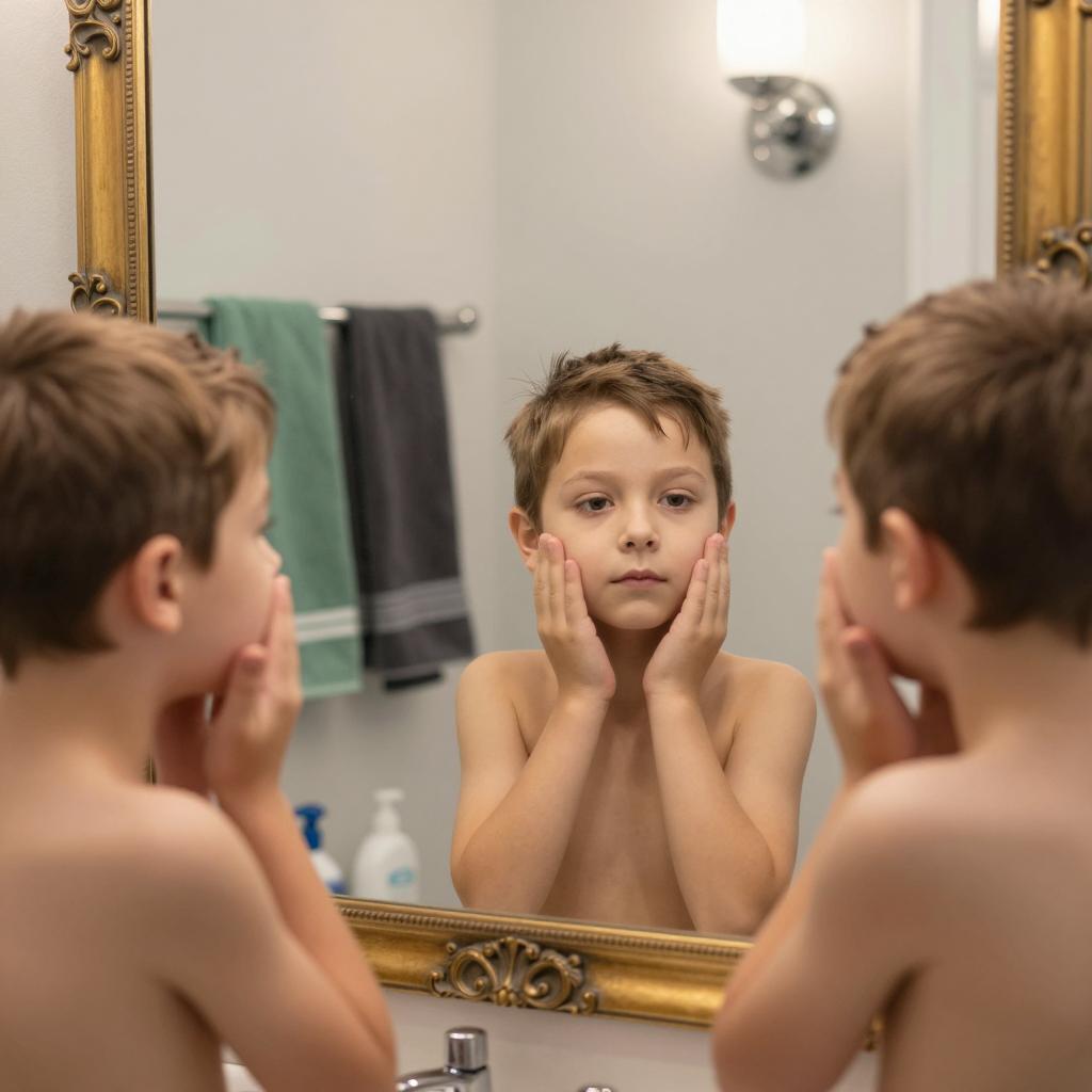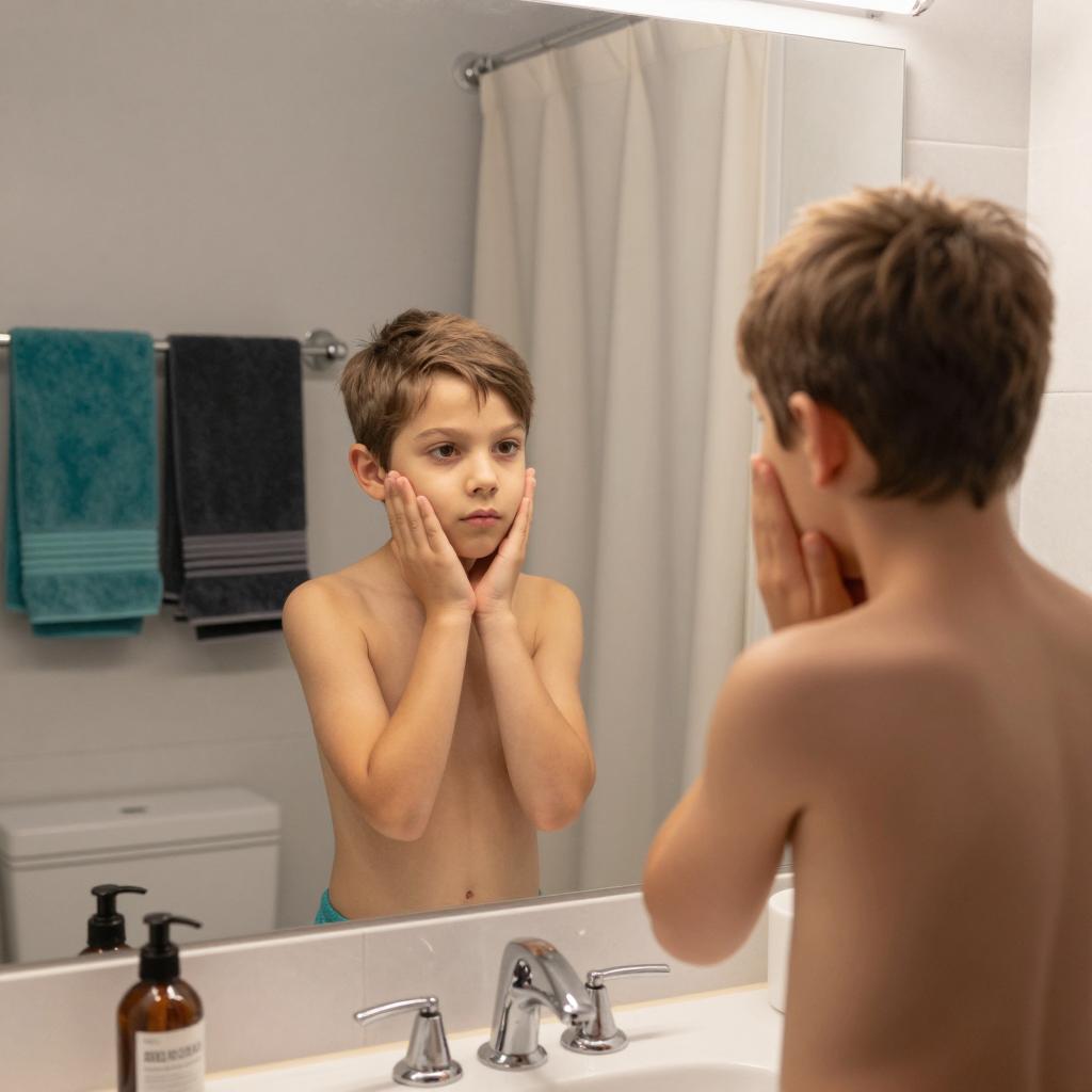 Shirtless young boy with light skin and short brown hair stands in front of a mirror, hands on cheeks. He gazes at his reflection with a neutral expression. Bathroom background with teal and black towels on a rack. Mirror has a light fixture above it. Cream-colored curtain on the right. Three small bottles on the sink counter.