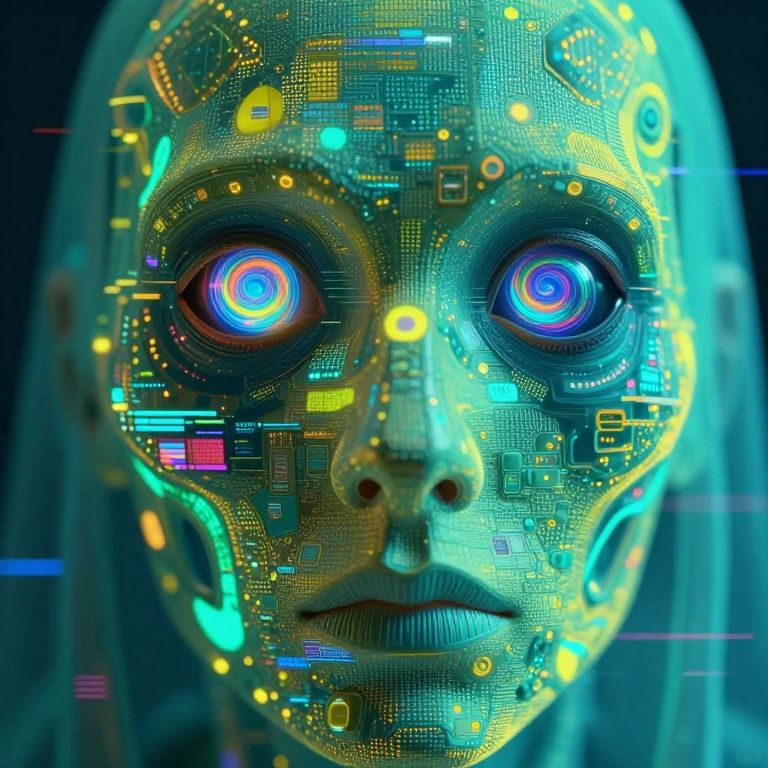 The image presents an extreme closeup of a glitchy holographic ghost's face, with a photorealistic and highly detailed appearance. The face is covered in a monochromatic teal and yellow color scheme, with vibrant, swirling orb-like eyes that emit a futuristic, synthwave aesthetic. The ghost's face is made up of geometric, glowing microscopic alien nodules, giving it a surreal and otherworldly appearance. The face is adorned with a colorful VHS filter, adding to the retro-futuristic vibe. The ghost's face is illuminated by a combination of natural and artificial lighting, creating a moody and cinematic atmosphere. The overall composition is intricate and beautifully color-coded, with a depth of field that enhances the realism and detail of the image. The ghost's face is the central focus, with the background blurred to draw attention to the ghost's features. The image is a stunning example of hyper-realistic photography, with meticulous attention to detail, color grading, and post-production techniques.