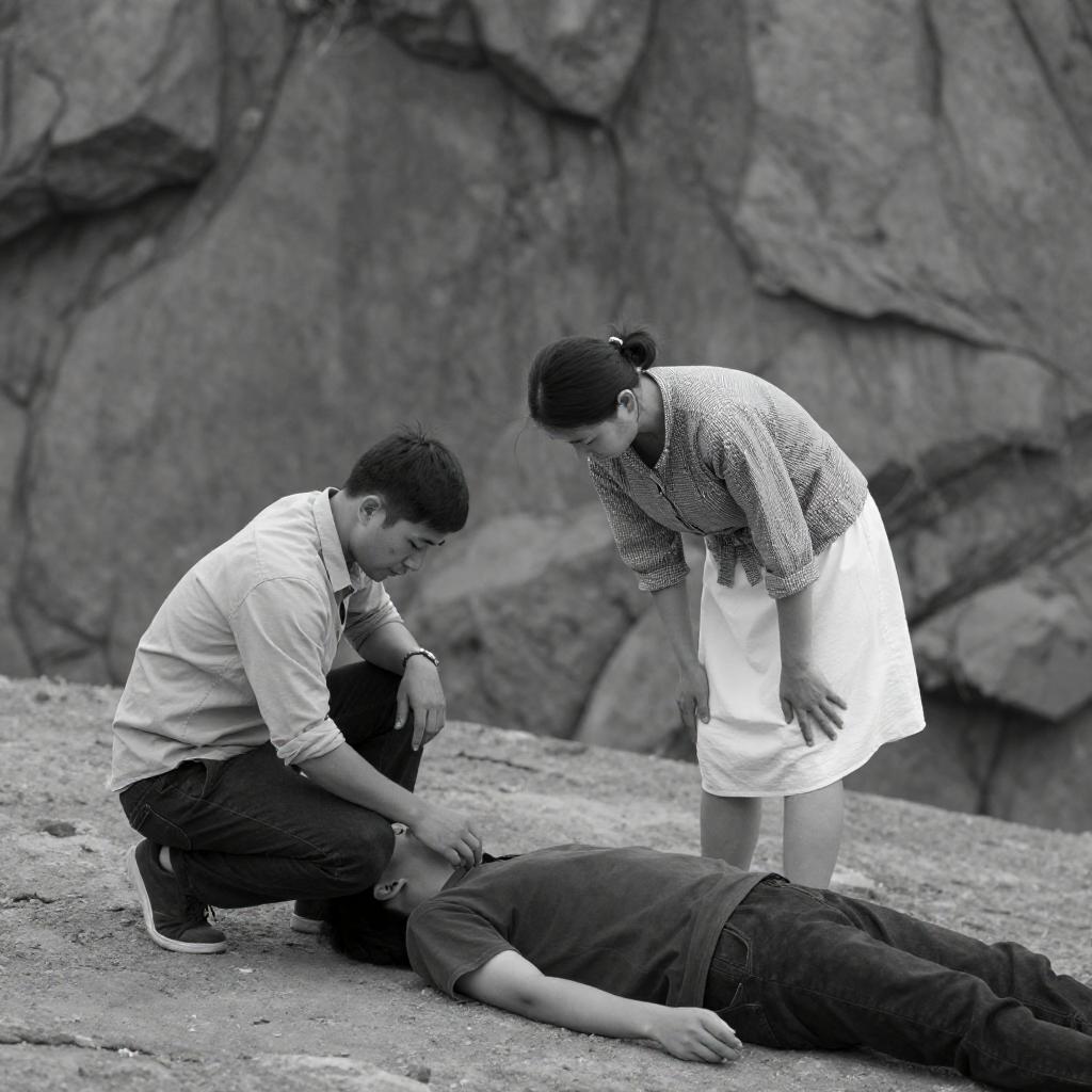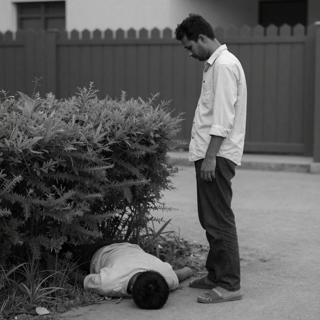 Black-and-white photograph of a man in a light shirt and dark pants standing beside a bush, looking down at a person lying on the ground with their head obscured by vegetation. The background includes a wooden fence and a building. The man's posture is relaxed, and the scene has a somber, gritty feel.