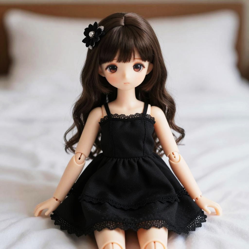 Realistic, photorealistic, hires, doll, dd, 1girl, hertasr, dress, dollgirl, wariza, on bed, joints, looking at viewer, hair ornament, flower, black dress
