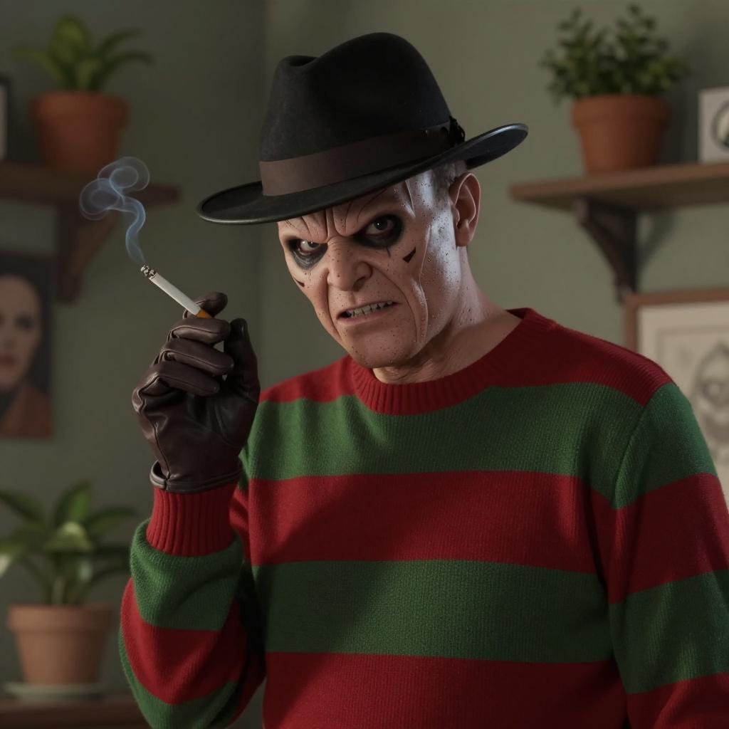 Freddie Krueger in a striped red and green sweater, brown hat, and claw glove, stands menacingly with mouth open. He grips the shoulder of a frightened boy with dark hair. The background has green and red lighting with ured walls. Two people. Intense facial expressions. Horror movie style.