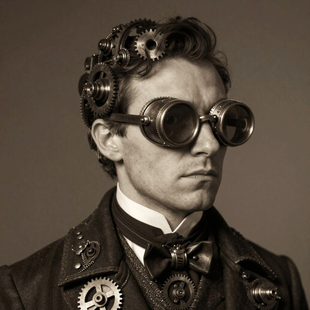 Sloan character portrait, steampunk aesthetic, brass goggles and mechanical gear, Victorian-era clothing, sepia tones, intricate textures