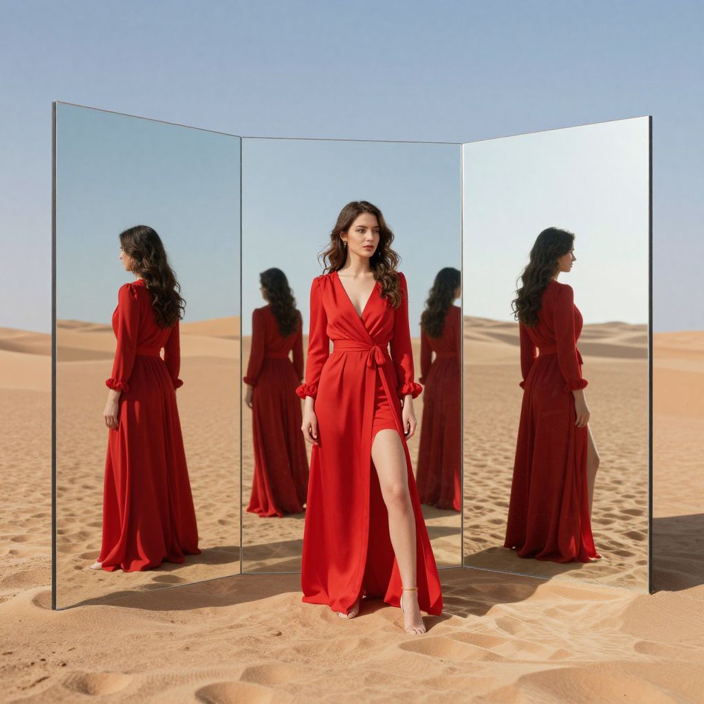 In a surreal desert landscape, three mirrored panels reflect multiple hypothetical versions of a woman in vibrant red attire, creating a thought-provoking visual effect that blends reality with imagination through digital artistry.