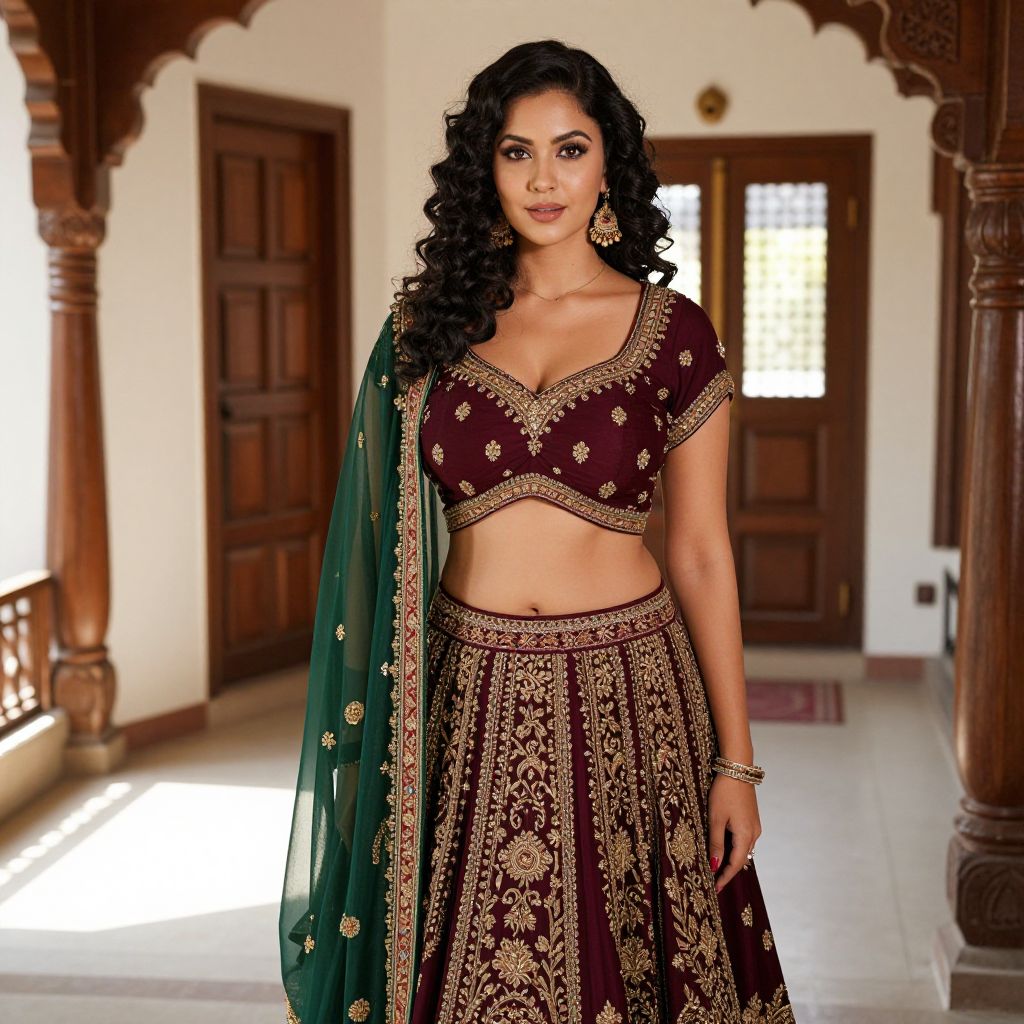 A fashionable Indian woman with tanned skin, long black curls, and warm brown eyes wearing a richly embroidered Bollywood lehenga choli in deep maroon and emerald green, posing in a traditional haveli house with wooden doors and ornate pillars, natural sunlight filtering through the window. The woman has big tits and cute face