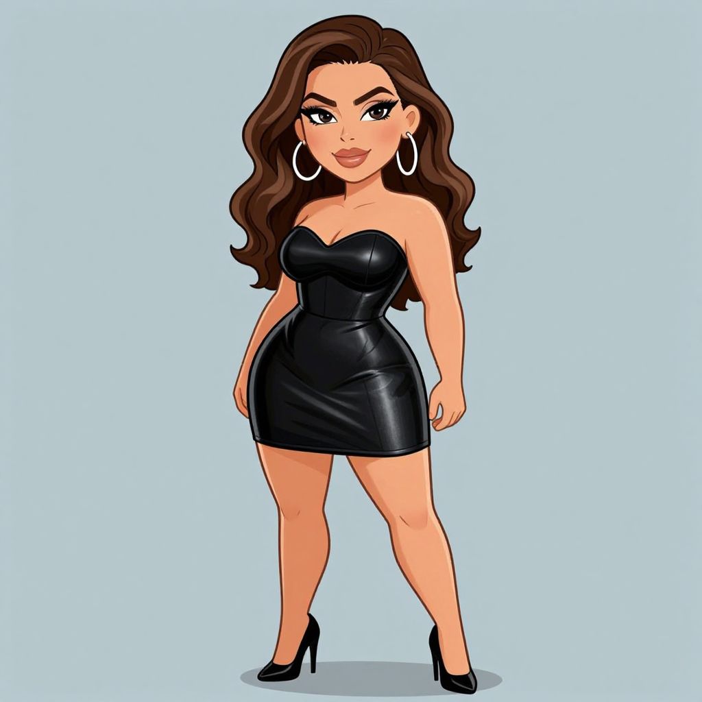 This digital illustration depicts a curvy, light-skinned woman with long, wavy brown hair and bold, dark eyebrows. She wears a tight, black, strapless leather mini dress that accentuates her hourglass figure and black high-heeled shoes. Her large hoop earrings add a touch of glamour. She stands confidently with a slight smile, arms relaxed by her sides, against a plain light blue background. The art style is cartoonish with clean lines and vibrant colors, emphasizing her confident and stylish appearance.