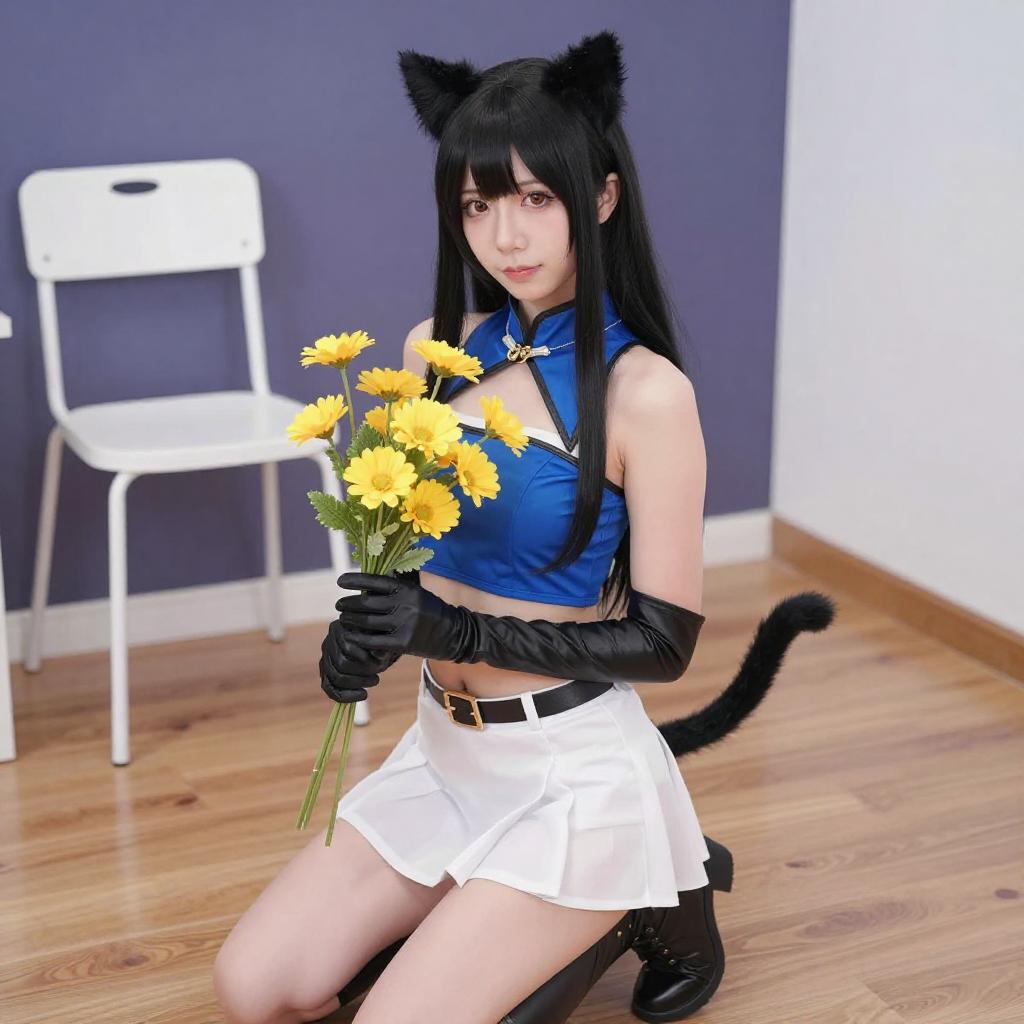 Photograph of an Asian woman with long black hair, wearing a blue and white catgirl cosplay outfit with black cat ears, a blue crop top, white skirt, and black gloves. She kneels on a wooden floor in a bright room, holding a bouquet of yellow flowers. A white chair and a dark purple wall are in the background.