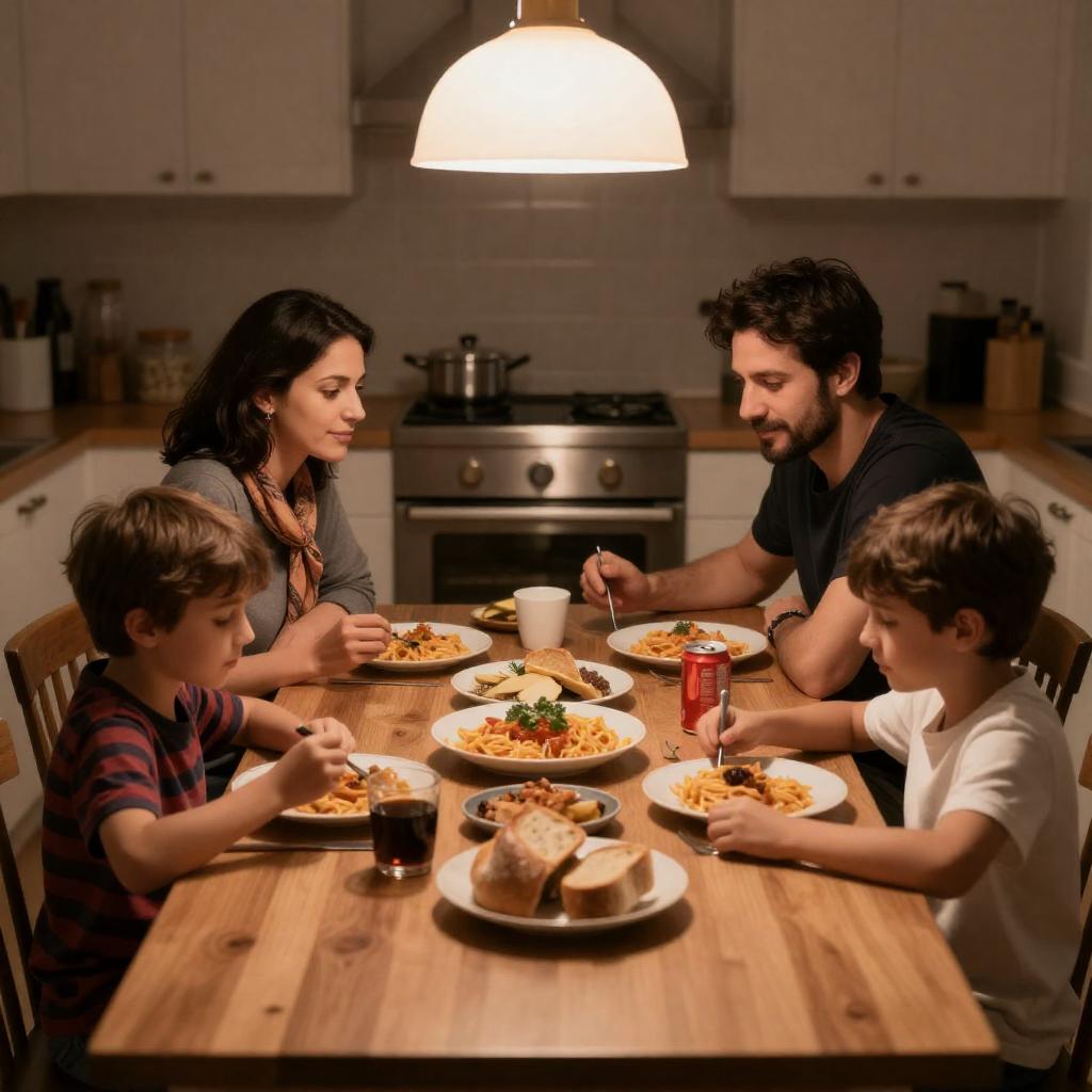 Photograph of a family of four sitting around a dining table in a dimly lit kitchen. A man with dark hair and beard, wearing a black shirt, sits on the right. A woman with dark hair, wearing a patterned scarf, sits next to him. A young boy with brown hair, wearing a red and black striped shirt, sits on the left. Another boy with short brown hair, wearing a white shirt, sits across from the man. The table is filled with food, including a plate of pasta, bread, and a red soda can. A lamp with a white shade illumin