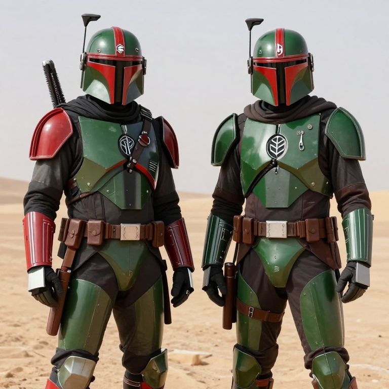 Digital artwork of two Mandalorian stormtroopers in green armor with red accents, black bodysuits, and blasters, standing in a desert.