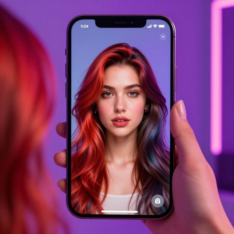 App to see yourself with different hair color, interactive augmented reality mirror displaying user’s face with dynamic hair color transformations, neon lighting, vibrant color palette, stylish and user-friendly design, photorealistic digital rendering