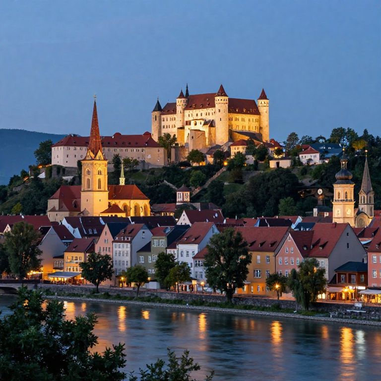 Photograph of a picturesque European town at dusk, featuring a large, illuminated, medieval castle with multiple towers and red roofs perched on a hill. Below the castle, charming, colorful buildings with red and brown roofs line the riverbank, their lights reflecting in the water. A tall church steeple is visible to the left of the castle. The sky is a gradient of deep blue, and trees dot the hillside. The scene is serene, with soft, warm lighting highlighting the architectural details and creating a peaceful, inviting atmosphere.