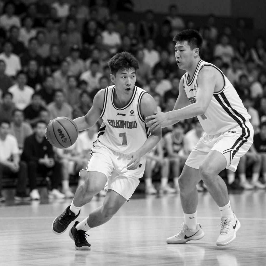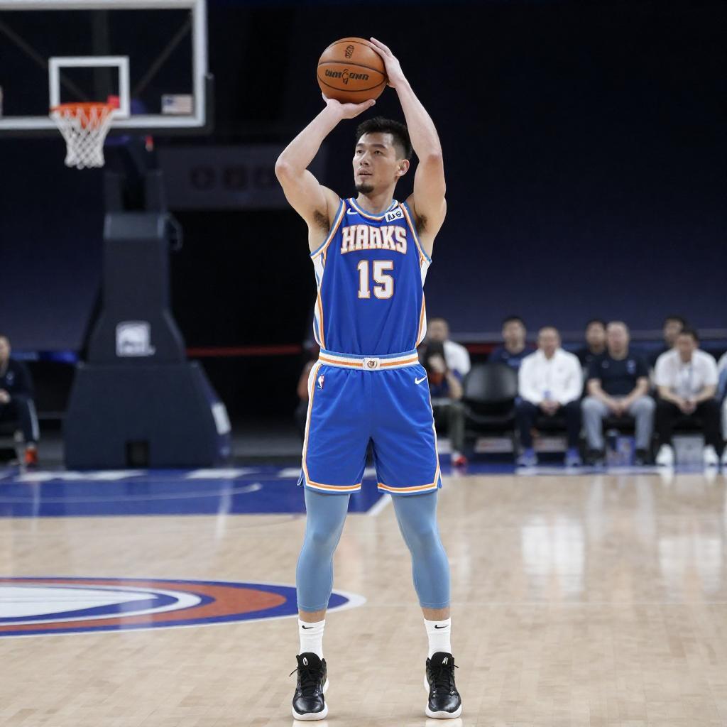 Photograph of a male basketball player in a blue jersey with "Hawks" and number 15, standing on a brightly lit basketball court, holding an orange basketball above his head with both hands. He wears light blue jeans and black sneakers. The background shows a blurred audience and a basketball hoop.