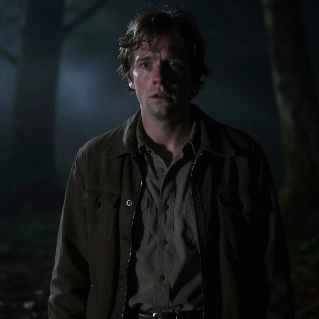 Young Tobin Bell in a classic horror movie scene, dark creepy forest background, low key lighting, fearful expression, eerie mist, detailed cinematic shadows