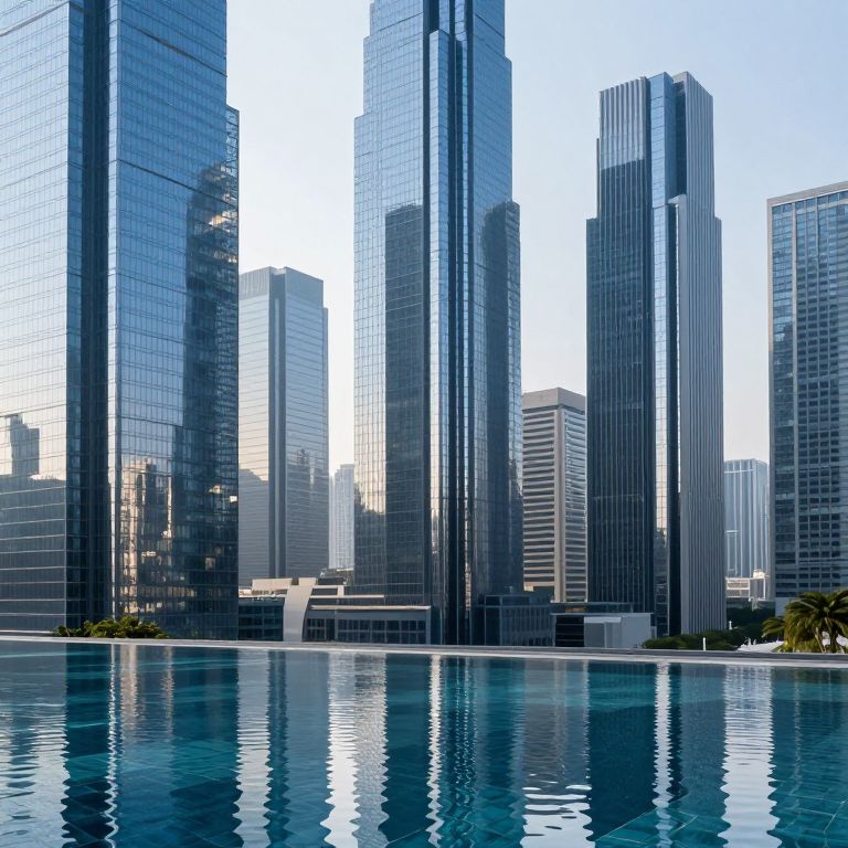 Photograph of modern skyscrapers with reflective glass facades, towering over a calm, blue swimming pool reflecting the buildings. Bright daylight.