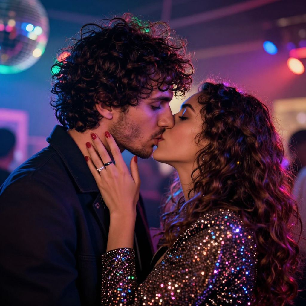 Photograph of a curly-haired, bearded man in a black shirt kissing a woman with wavy brown hair wearing a sparkly, sequin-covered top. The woman's left hand, with red-painted nails and a ring, gently touches his face. They're under colorful disco lights, with a blurred background featuring a spinning mirror ball and indistinct figures. The image has a vibrant, neon-lit ambiance, emphasizing the intimate moment. The man's expression is soft, and the woman's eyes are closed, adding to the romantic atmosphere.