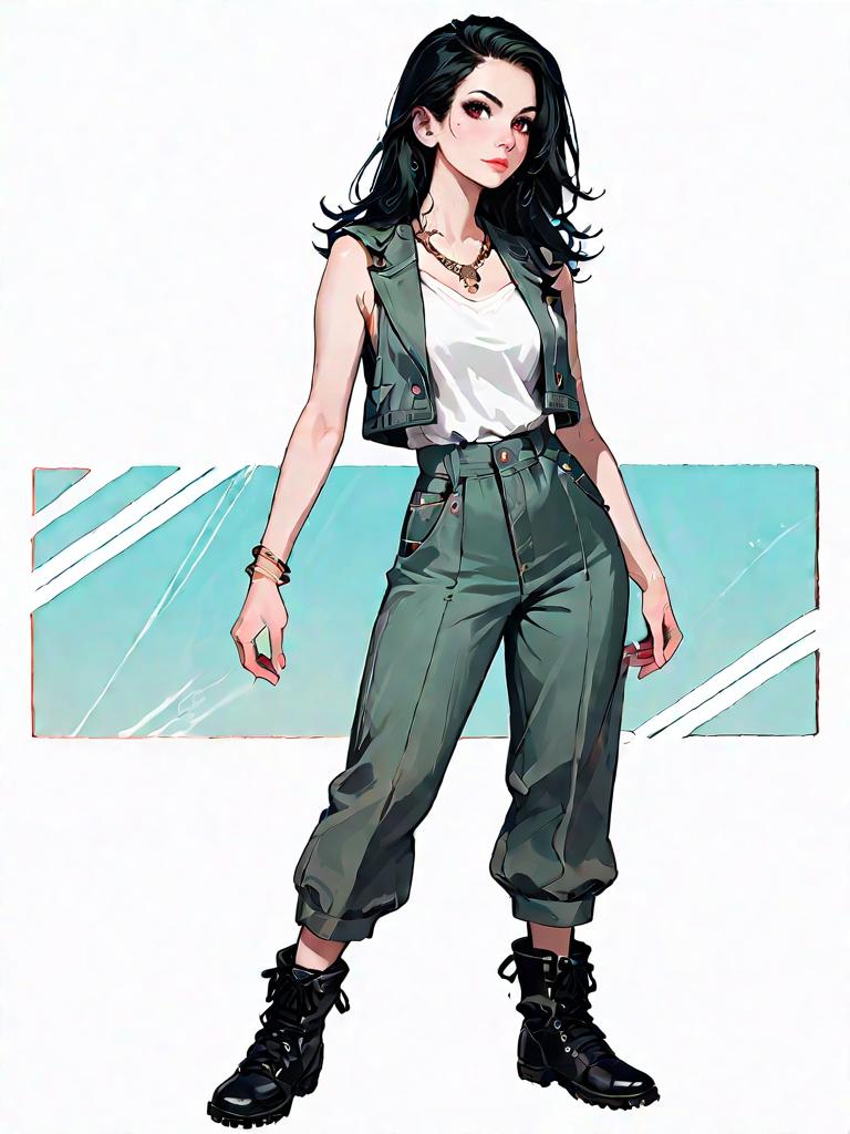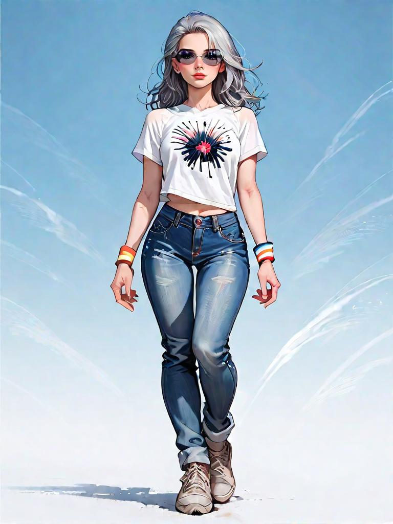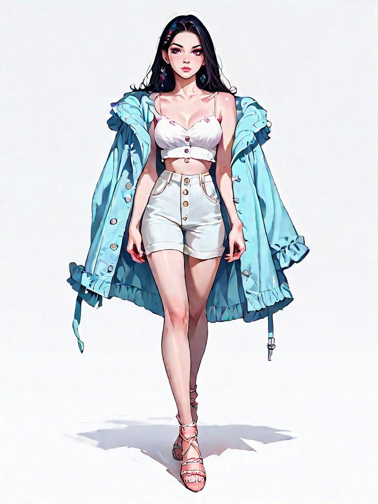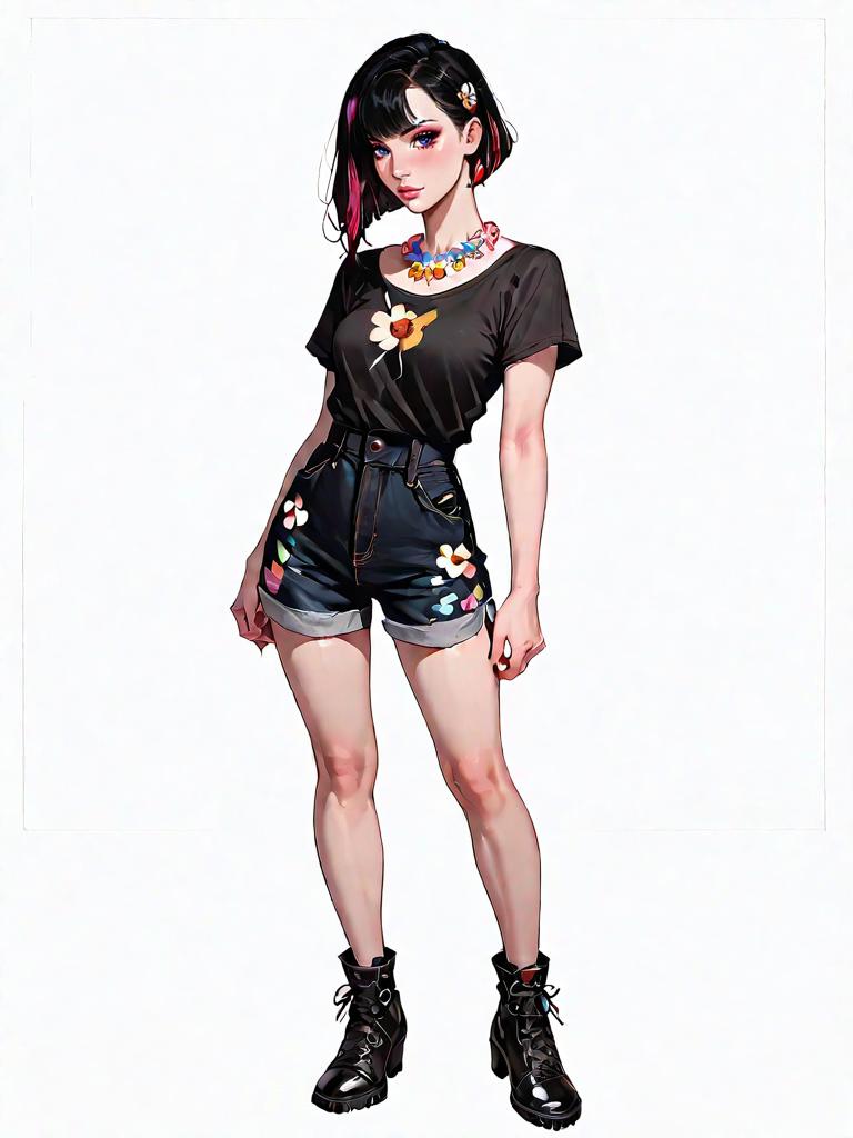 1girl, source_comics, realistic face, full body shot, Woman, casual chic, oversized white V-neck T-shirt, short sleeves, possibly semi-sheer fabric, tucked into black denim shorts, barely visible, minimal gold-tone bracelet, white background.