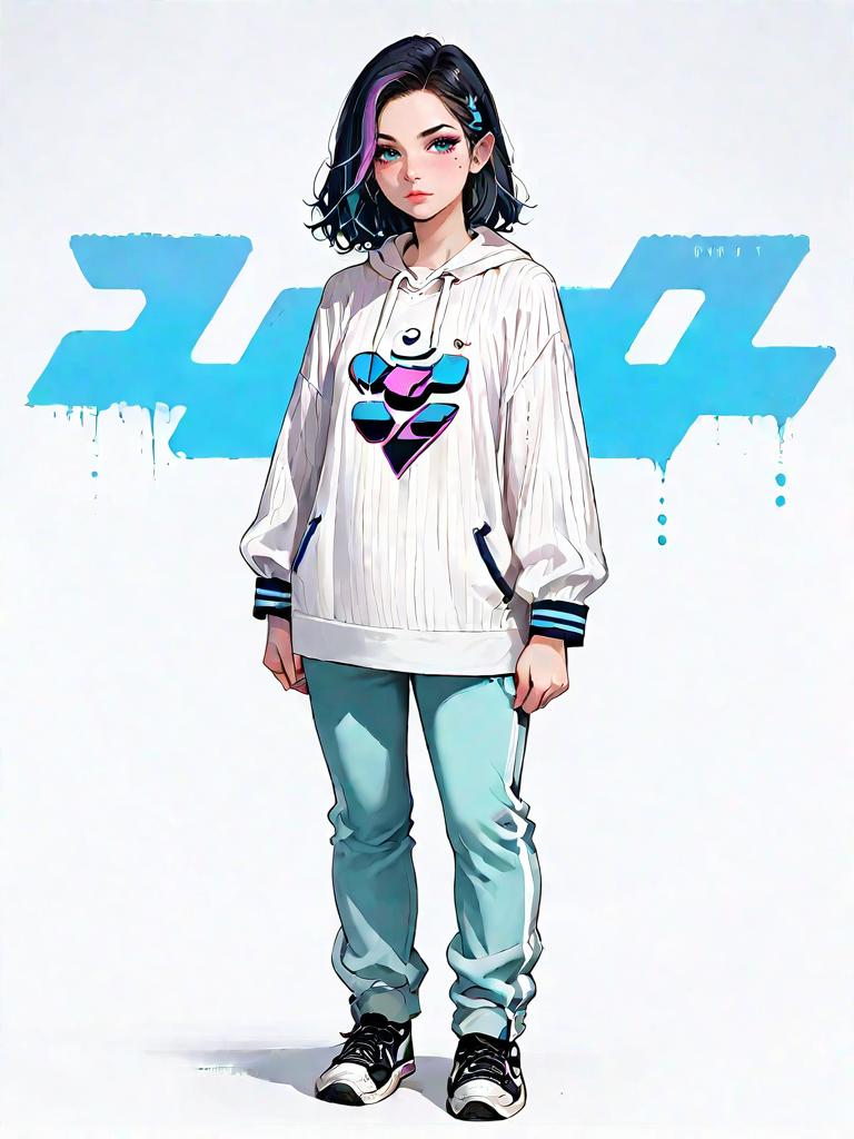 Full body shot of a young woman with short black hair wearing an oversized white graphic T-shirt featuring black dripping eyes design, paired with distressed denim shorts and high-top sneakers. She accessorizes with colorful bracelets and hair clips, standing against a plain white background in a casual chic style.