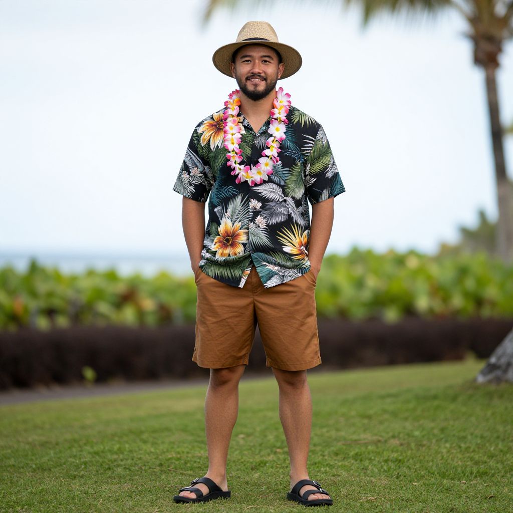 Photograph of a bearded man with medium brown skin, wearing a floral shirt, tan shorts, straw hat, flower lei, black sandals, standing