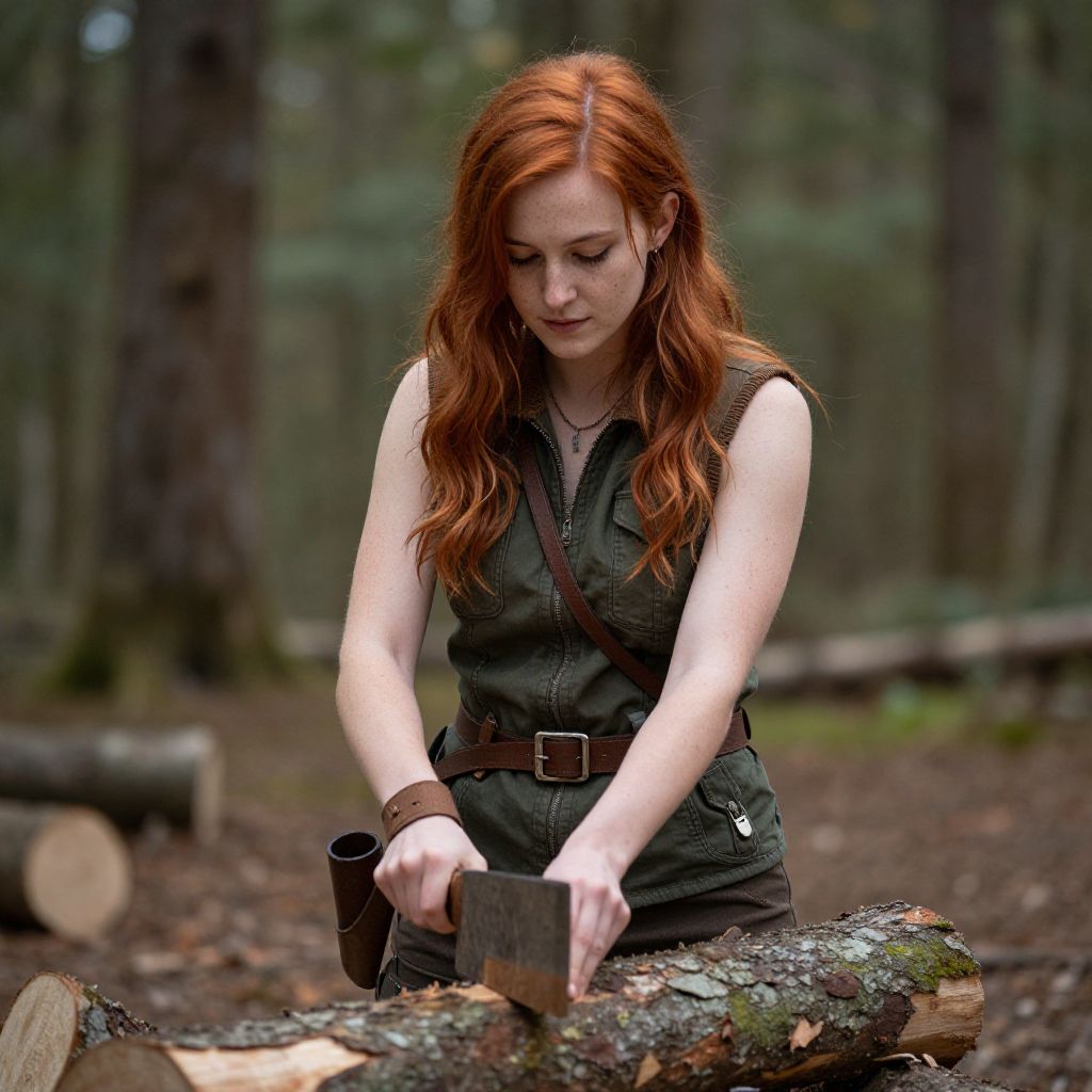 A photograph of a fair-skinned, red-haired woman with long, wavy hair, sitting in a forest. She's wearing a sleeveless, dark green, button-up shirt with a brown belt and a leather strap across her chest. She is chopping a large log with a hatchet, her focused gaze on the task at hand. The forest background is blurred, featuring tall trees and scattered logs on the forest floor. Her freckled face and natural makeup add to her rustic appearance. The lighting is soft, highlighting her pale skin and red hair.