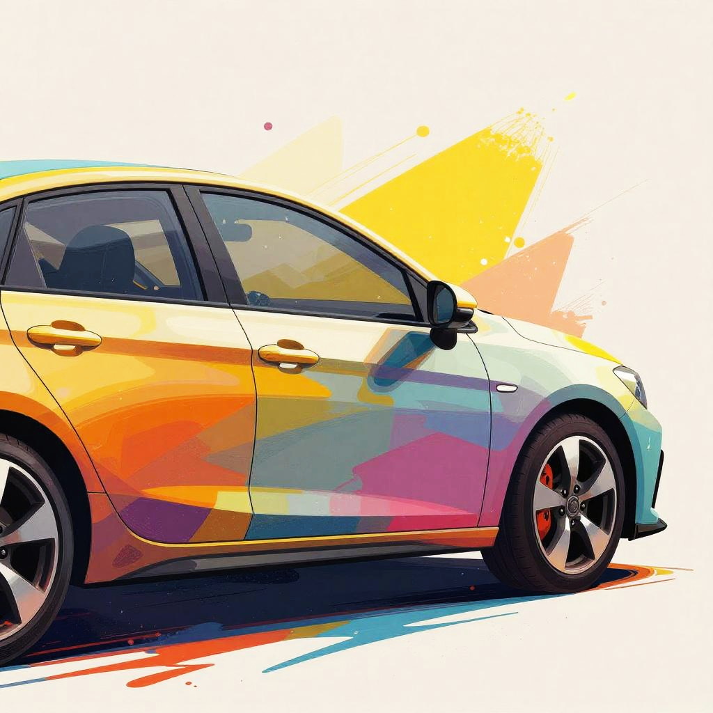 Illustration of a compact hatchback car viewed from the side, featuring vibrant and abstract geometric color patterns including shades of yellow, orange, blue, and pink. The artwork has a modern and rough shape style with high dynamic range and 8k resolution quality, showcasing an artistic and colorful vehicle design.