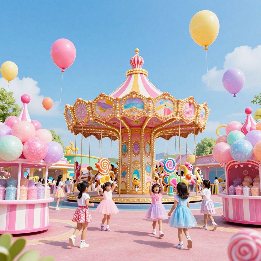 Bright, colorful carnival scene with children in pastel dresses, a gold and pink carousel, and floating balloons under a clear blue sky.